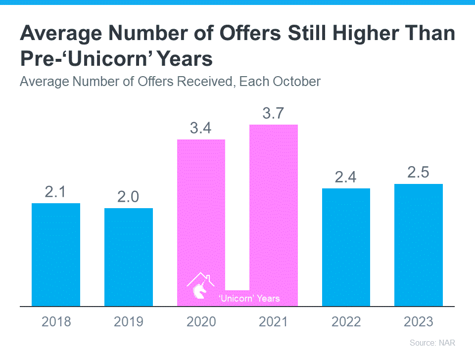 It’s true that’s fewer than the number of offers sellers were receiving during the ‘unicorn’ years (shown in pink). But compared to last year, the number is up slightly. And it’s higher than it was in the more normal, pre-‘unicorn’ years in the housing market too.